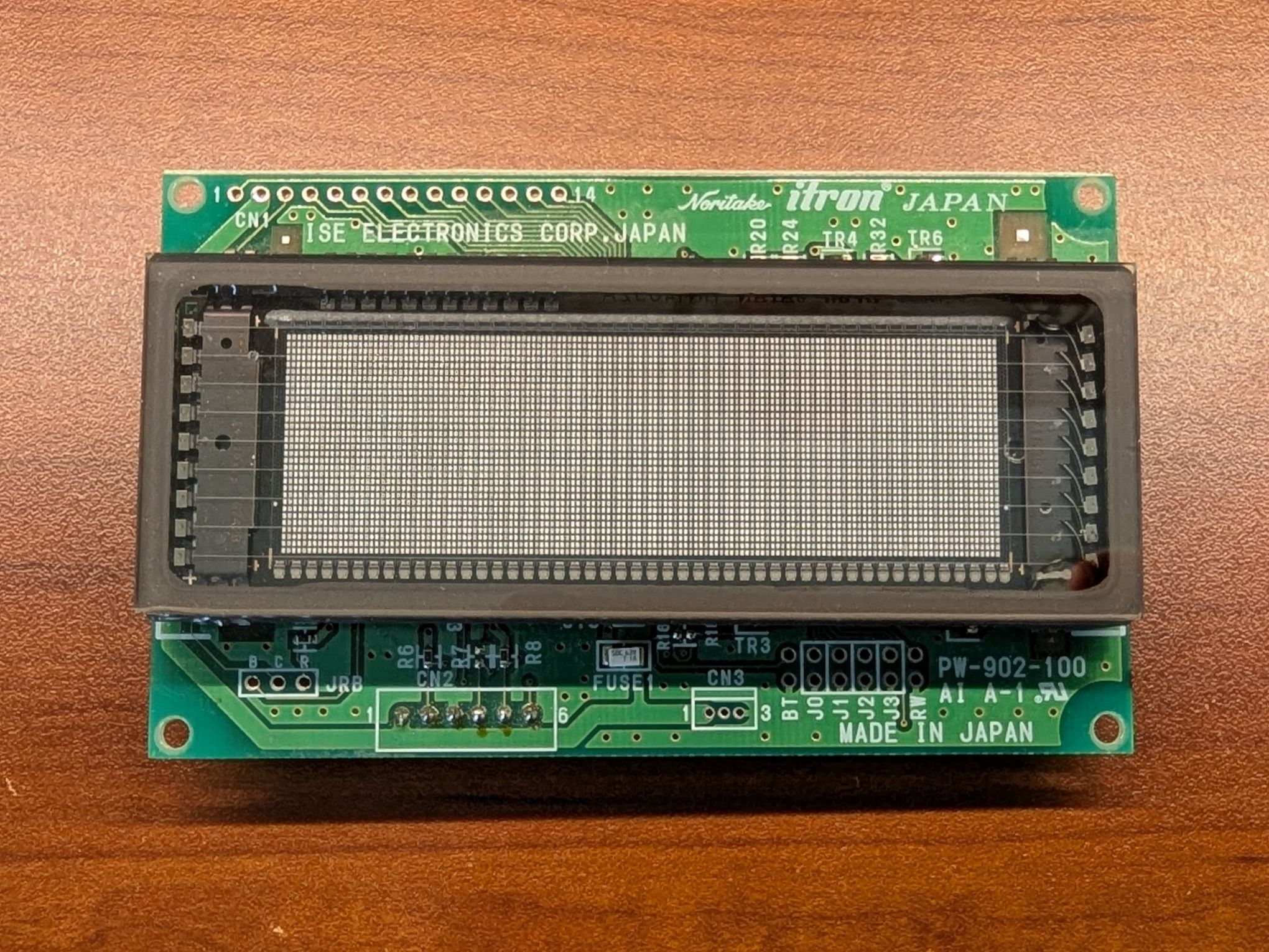 The PCMF uses a Noritake Itron GU140X32F-7003 VFD module, which was a generous donation by the manufacturer to our university. It is a